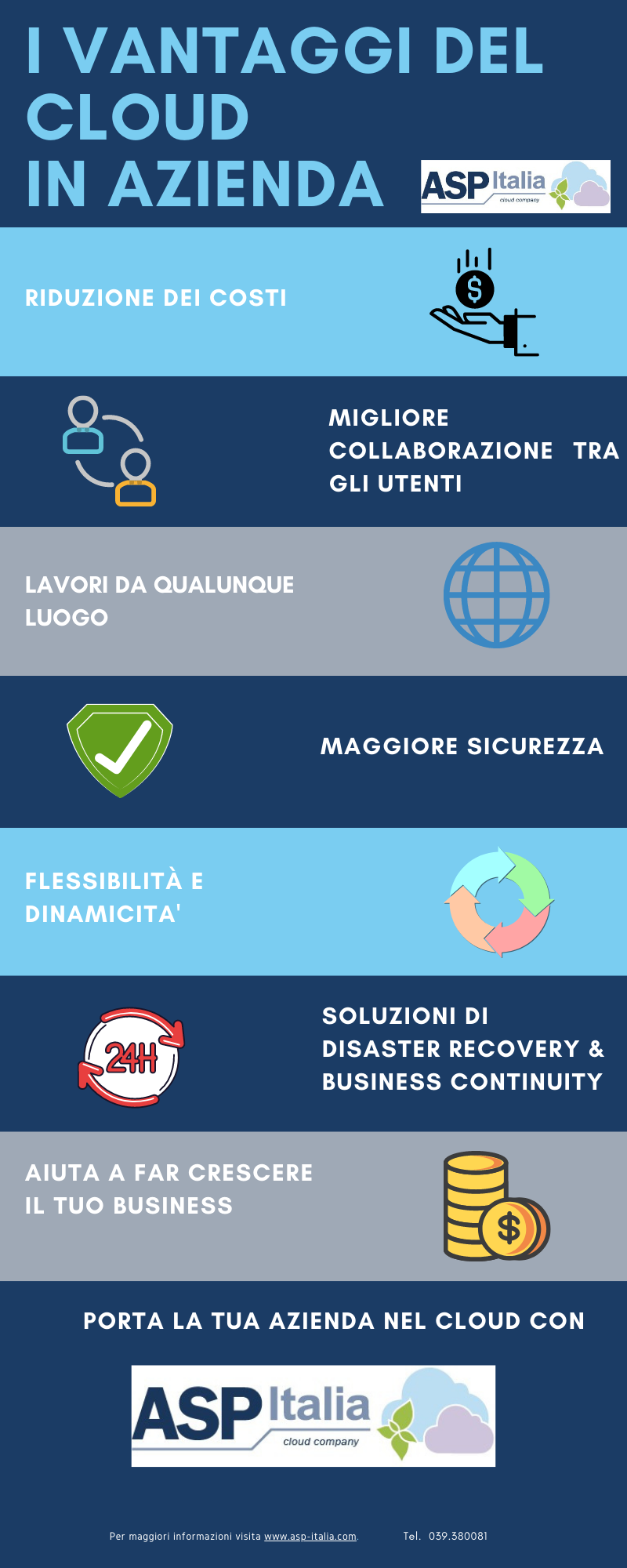 Il cloud computing garantisce anche una manutenzione IT ai massimi livelli da parte del nostro team: tutti gli aggiornamenti dell’infrastruttura IT e la manutenzione in azienda vengono eliminati perché gestiti direttamente da ASP Italia.